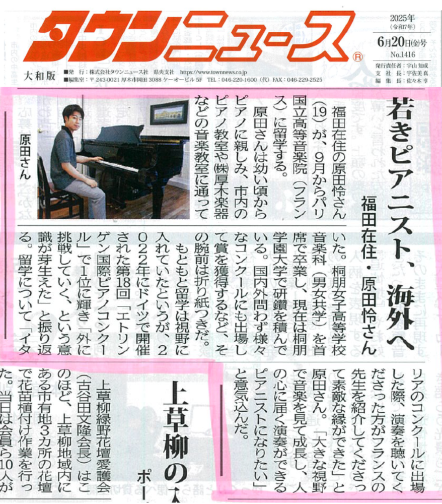 このたび、厚木楽器の元生徒さんが、地域情報紙「タウンニュース」に掲載されました!