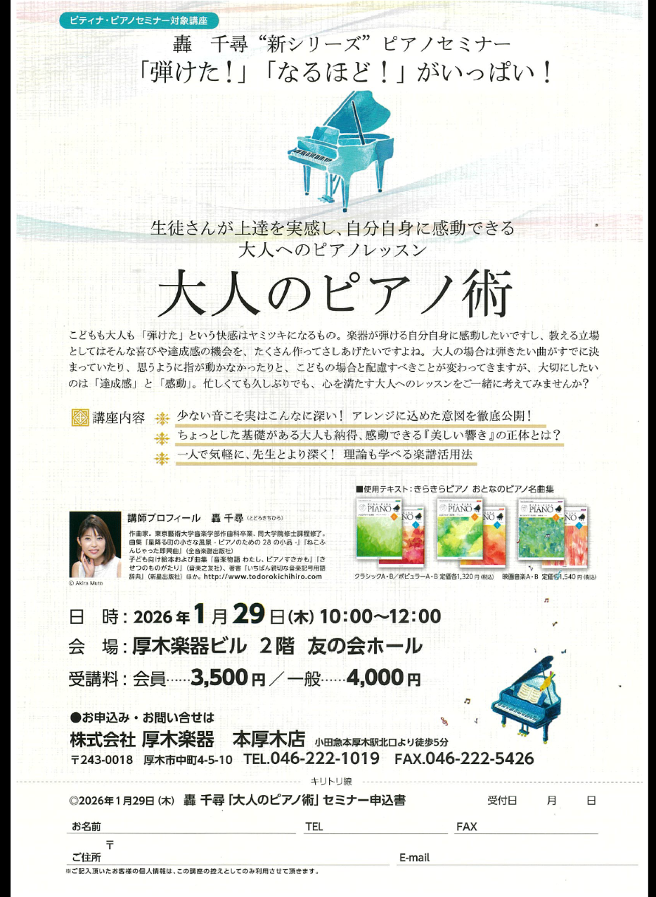 美しいアレンジで人気の轟千尋先生‼ おとなのピアノレッスンについて公開講座を開催します。