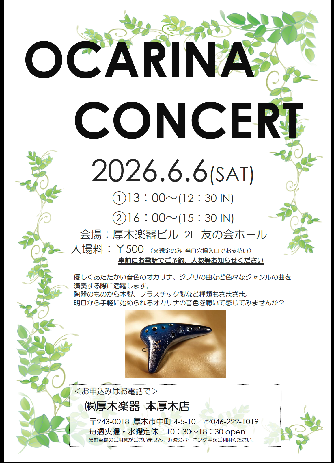 6/6㈯ 厚木楽器ビル2階 友の会ホールにて「オカリナコンサート」を」開催します!