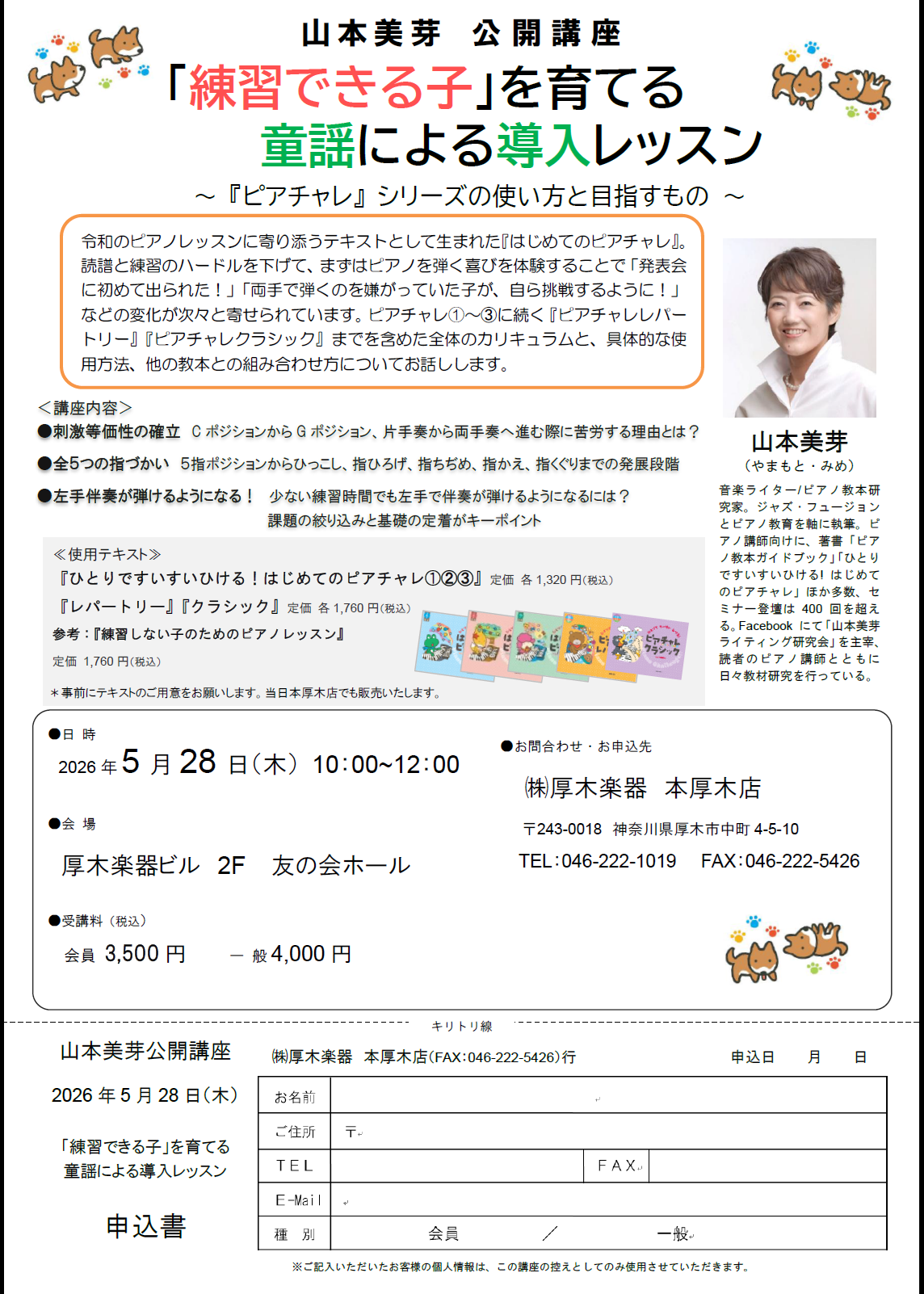 5月28日㈭ 10:00~12:00 厚木楽器ビル2階友の会ホールにて音楽之友社出版「はじめてのピアチャレ」シリーズを使った指導法を著者である山本美芽先生にわかりやすく解説いただきます。
