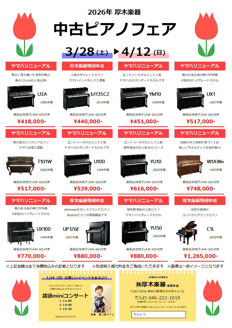3/28(土)~4/12(日)、中古ピアノフェアを開催します!